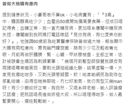 钱小豪身体没有大问题,小毛病不少,有3高要定期吃药,但没有糖尿病,对于患癌传言,钱小豪不想理会,坦言做人最重要开心,瘦下来身体会相对轻松。