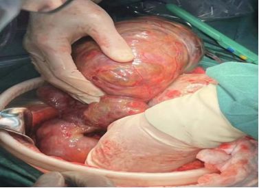 本病例影像表现特点,葡萄胎不考虑。然而由于肿物在术前来源并不明确,即使妇科来源,若不排除恶性肿瘤,肿瘤侵犯周围组织,手术探查风险亦较高。术中应谨慎辨清肿物的边界及与周围组织的解剖位置关系,逐步分离探查。
