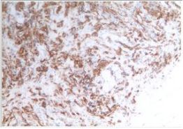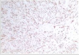 经HE染色及免疫组织化学检测,IHC:CD10(灶区+),Vimetin(+),ER(2+),PR(0),S-100(-),SMA(部分+),WT1(-),CD34(灶区+),Caldesmon(-),Des(+),Ki-67(1%+),CD117(-),Dog-1(-)。双侧附件未见特异性病变。腹水检查未查见异常细胞。