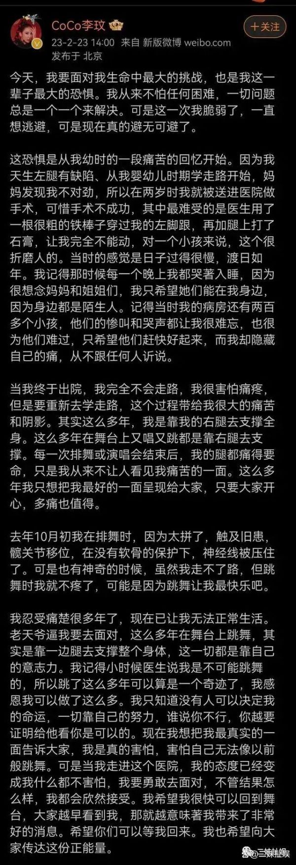 在这则消息当中,她也将事情的原委进行了详细地介绍。她表示自己的左腿是天生就存在一些缺陷的,并且做手术做得不成功。这才导致了出道至今在舞台上跳舞完全是靠右腿来支撑完成的。但是从2020年10月开始,她的旧患发作了,发生了髋关节移位的情况。
