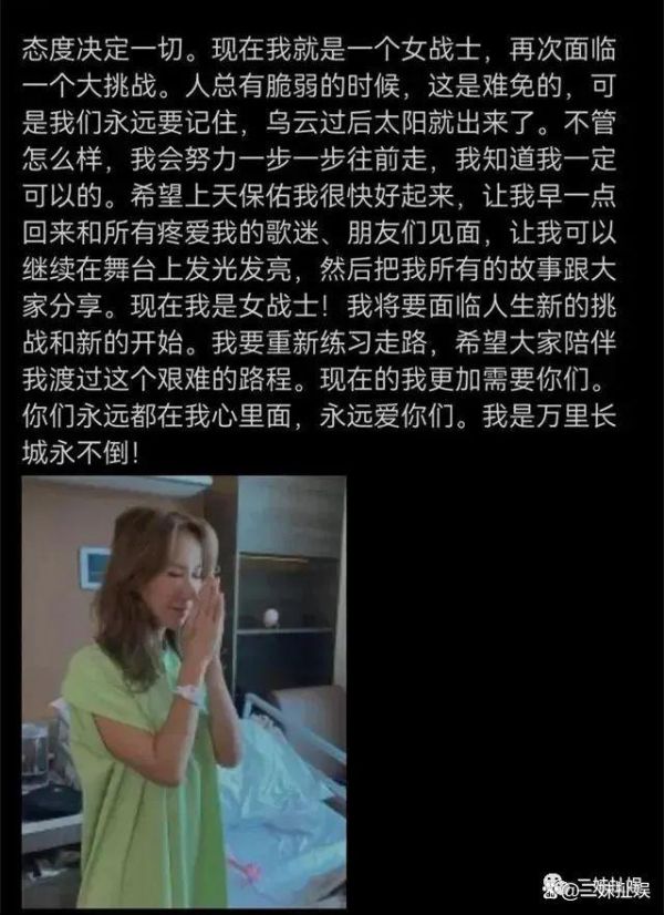 她还表示既然老天爷让她不得不去面对这件事情,她也只能正面去面对。事实上,她这些年支撑她完成自己的事业的,除了自己健康的右腿之外,还有自己顽强的意志。同时,她也希望自己可以尽快地回到属于自己的舞台,重新进行自己的事业,给广大喜欢她的朋友带来更多好听的歌曲。