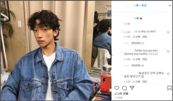 在Rain晒出的照片里,他烫了一头羊毛卷、穿着牛仔外套,看起来依旧非常年轻,只不过他的脸颊却有些凹陷,面部轮廓和下颌骨都很清晰,脸色也略显憔悴。
