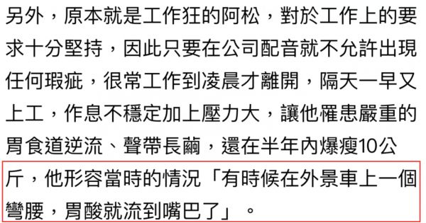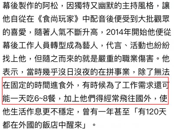 阿松自曝身体曾亮红灯,有时候工作强度很大,他一天到晚也吃不上饭,忙到三餐只能应付着填一下肚子,完全不能满足身体的营养需求。有时候又走向另一个极端,一天要吃6~8顿饭,暴饮暴食让肠胃不堪重负。