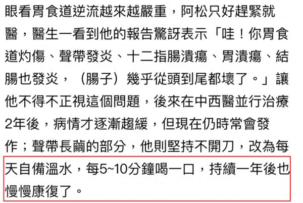 后来,阿松得知自己病情很严重后,意识到身体健康的重要性,尝试着改变自己的作息与习惯,并坚持不动刀。他自己每天每隔5分钟就喝水,保持肠道畅通坚持1年多就慢慢变好了,现在身体比以前好了很多。