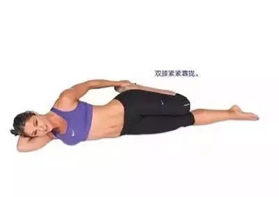 ◆ 侧卧,头部靠着下臂。弯曲上面的膝盖,并用同一侧的手抓住脚踝;拉动脚后跟向着臀肌靠近。