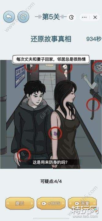 2.拖动红色衣服邻居至左边的门、戴眼镜邻居至右边近处的门、白色背心邻居至右边远处的门3.点击丈夫的裤袋、妻子手臂的淤青、撬棍、任意一个邻居的脸部。