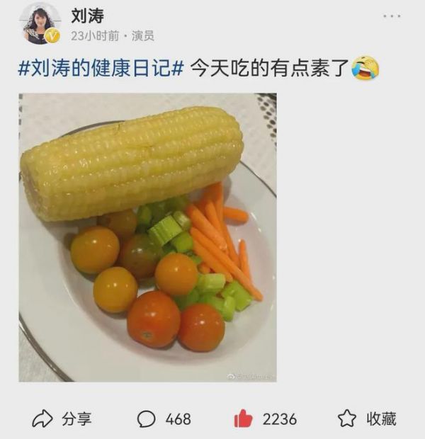 今日,著名女演员刘涛在自己的社交账号上发文称“今天吃的有点素”,话题是#刘涛的健康日记#,并且附上一张食物图。