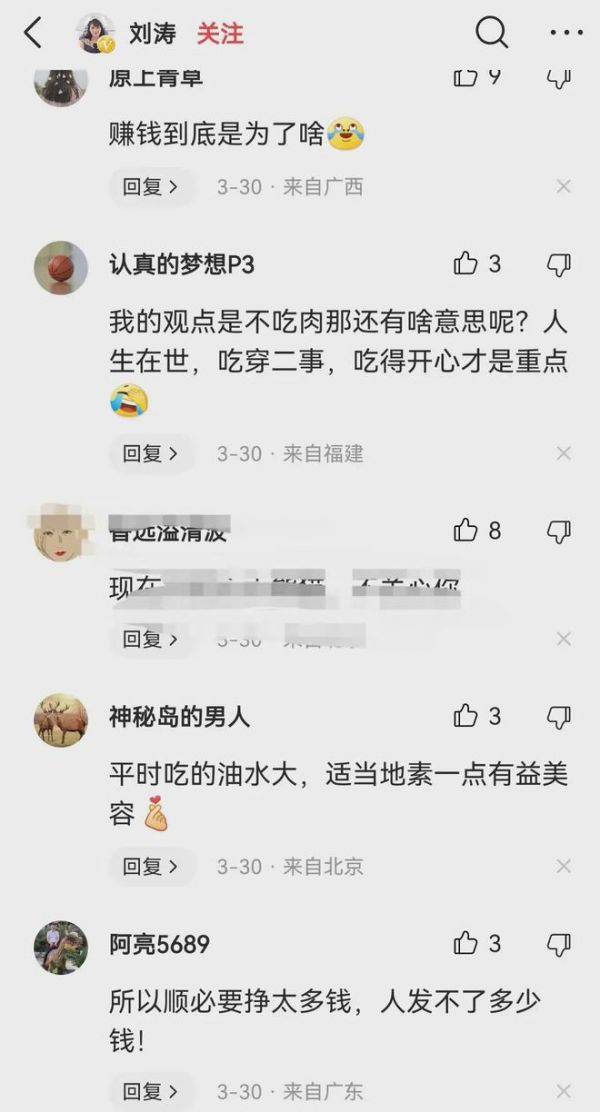 对此路人表示,减肥是营养搭配,没有肉会失去很多快乐,明星赚钱到底是为了啥,这样吃赚钱都没有动力,调侃道:是饭前吃还是饭后吃,一天的量还是一顿的量