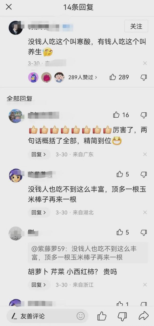 其中有一条“没钱人吃这个叫寒酸,有钱人吃这个叫养生”的评论成为热评,下面有很多跟帖回复称精简又到位。