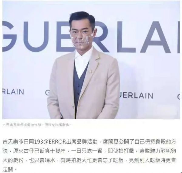 近日,51岁男神古天乐现身活动现场,和大家分享了自己保持身材的方法,声称:自己坚持每天只吃一餐,一坚持就坚持了十几年,除了自己固定每晚6点多吃顿饭,其他时候饿了光喝水。