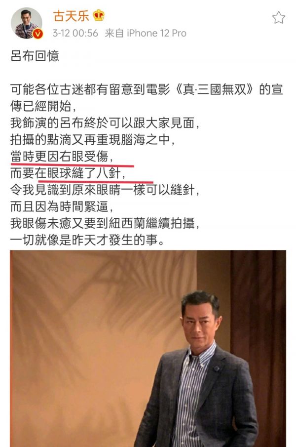 今年3月,古天乐曾主动在社交平台分享,拍戏时眼球表皮被道具划伤缝了八针。感慨表示:自己伤口虽然还未痊愈,但为了不影响剧组拍摄进度,马上就赶往了国外赶戏。此外,他还透露如今眼睛已经近视高达900度,此外还有白内障。所以他的身体状况一度令不少粉丝担心不已。