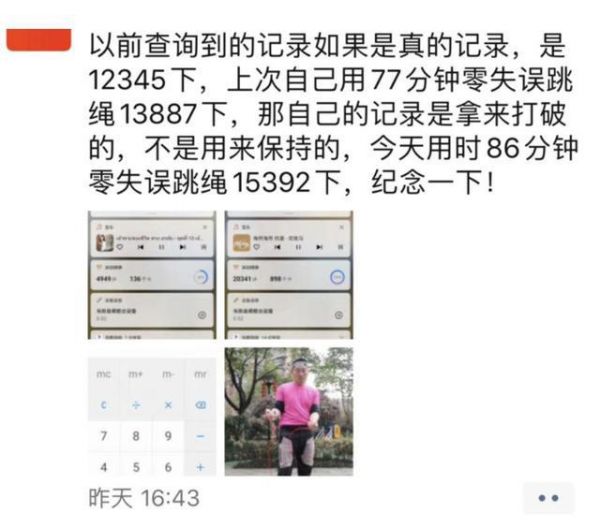 最牛的是,人家还把跳绳玩出了花样,前天更是突破自己的记录:连续不间断跳绳15392下,用时86分钟。