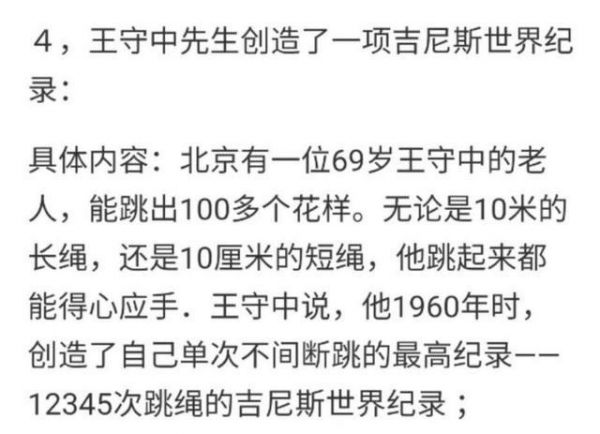 还有个吉尼斯记录,是24小时跳绳13万个,跳了一天一夜……佩服佩服。