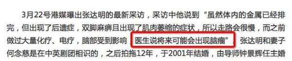 这也是他患病8年中为数不多的一次露曝光,在采访中,张达明罕见地向外界解释了自己近期的身体状况,称自己现在仍受治疗后遗症的影响,“双脚麻痹且出现了肌肉萎缩的症状”,还表示此前医生还告诉他后续会有脑瘤的预警。