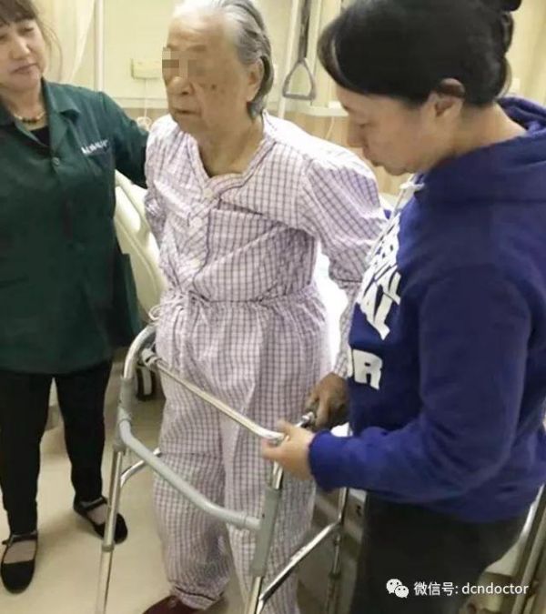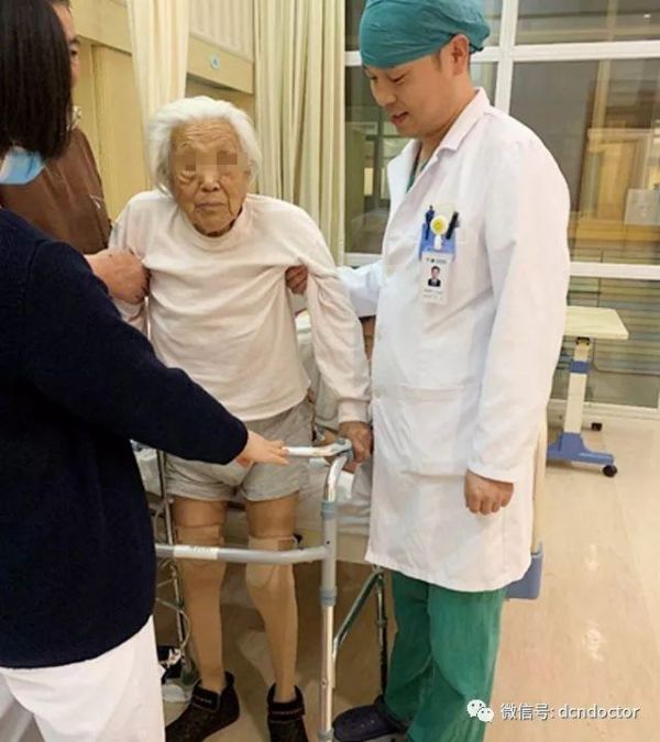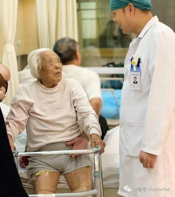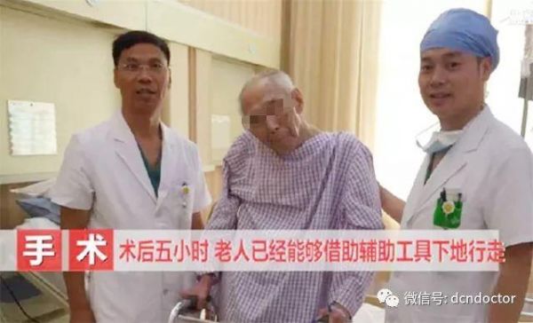 98岁高龄,髋部骨折,进行了髋关节置换,手术用时26分钟,术后7小时,在医生和家人的搀扶下下床活动,可以自由坐起。