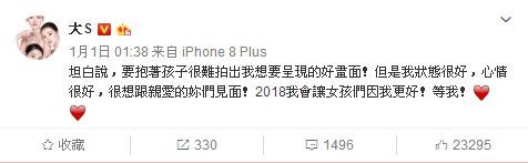 2018年的第一天,大S莫名的发了一条让粉丝们十分期待她口中的:“2018我会让女孩们因我更好!”是什么意思,难道是完成生宝宝的任务后要复出了?