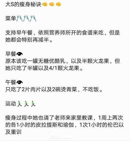 而一个月成功减肥20斤的大S也给想减肥的胖妞们提供了她自己的瘦身食谱,为身材苦恼的女同胞们乃们先来看一下自己能不能做到: