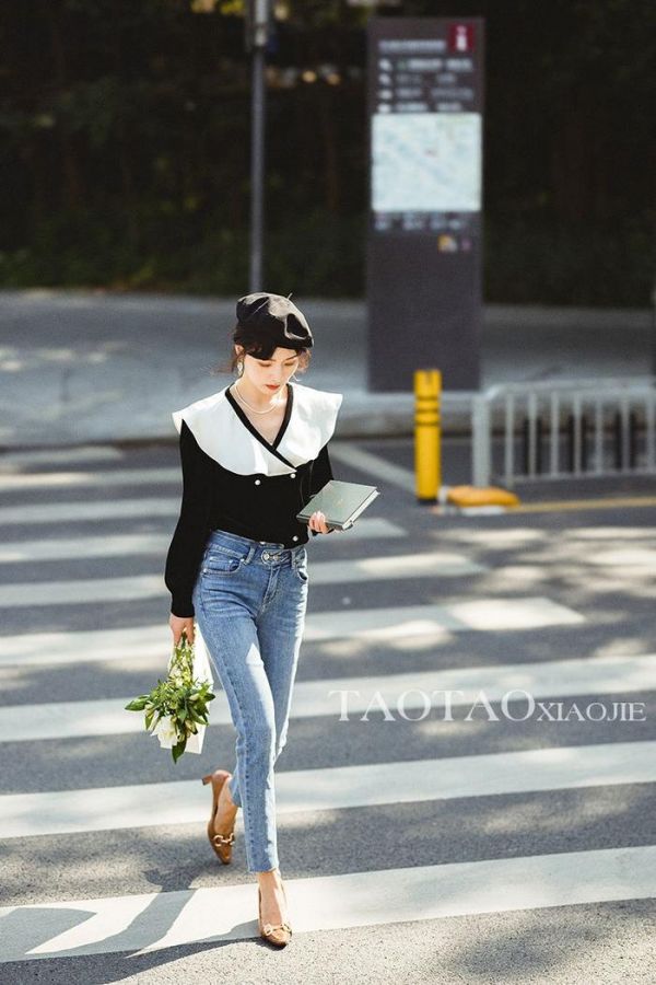水洗蓝的牛仔烟管裤,就是让造型显得更加日常的效果,再去搭配黑色的直筒西装,就不会给人一种过于正式干练的气息,反而多了一份飒爽高级的效果!白色衬衫搭配上水洗蓝九分裤,原本是属于休闲造型,但是有了黑色西装的叠穿,就增加了不少气场,弱化了过于休闲的效果。