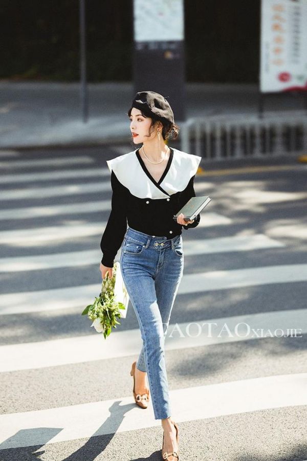 像这种偏向休闲风的烟管裤穿搭,更加符合日常生活中的穿衣条件。白色的V领衬衫性感高级,结合系带设计和喇叭袖款式,让造型增添了不少趣味性,系带散下来更显随性洒脱感,将其塞进牛仔烟管裤中,九分长度搭配白色踝靴,上下呼应显高又显瘦。
