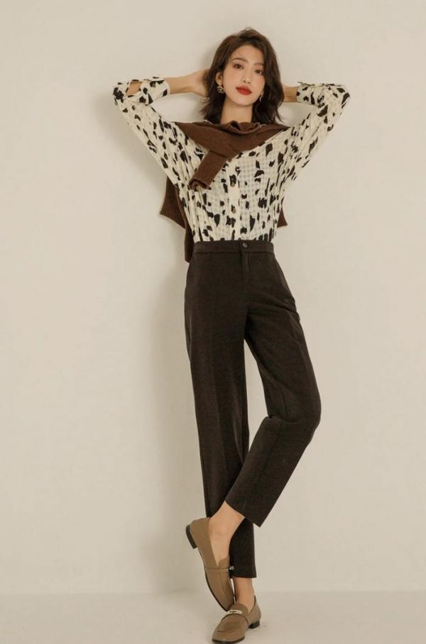 整体的穿衣打扮要有繁有简,这里的“繁”并不是指繁琐复杂,而是具备一定的吸睛效果,利用时髦元素提高造型亮点。印花元素的雪纺衬衫带有一丝透肤感,增加了造型轻盈飘逸的程度,叠穿棕色披肩打造沉稳大气的格调,这个时候搭配一条黑色的烟管裤,就能调节整体造型的完美程度。