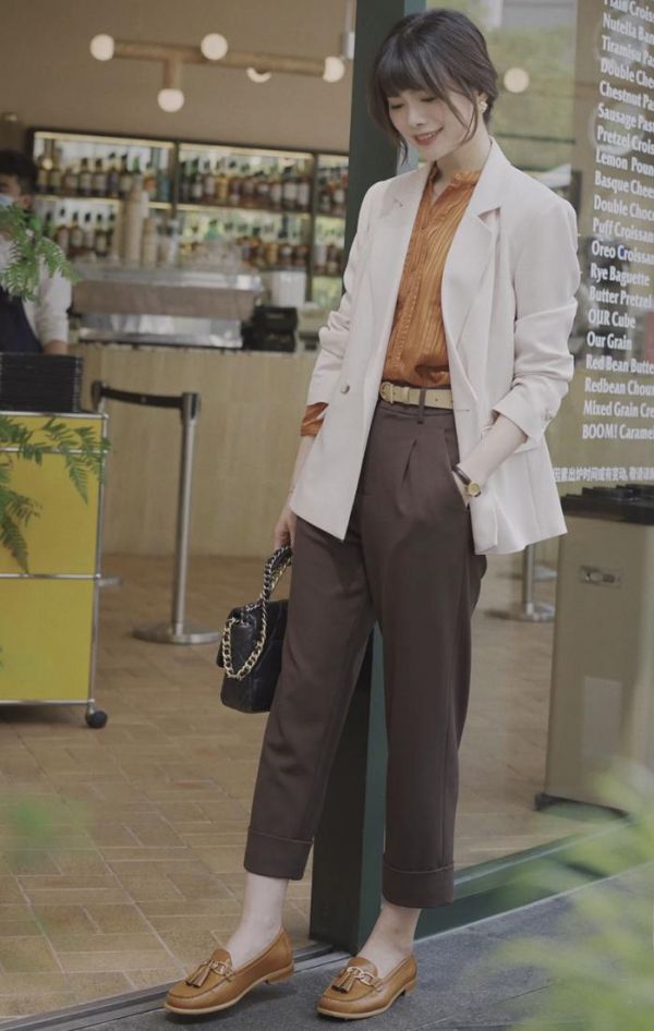 橘色衬衫+米白色西装外套+褐色烟管裤
