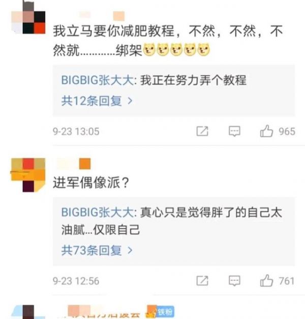 随后不久张大大又晒出了一组自己减肥后的照片,不得不说,减肥后的他确实顺眼了许多,也没有之前看上去那么油腻了,有网友好奇的问他“要进军偶像派?”他也回应道:真心只是觉得胖子的自己太油腻。看来他真心觉得自己如今去同油成功了呢。