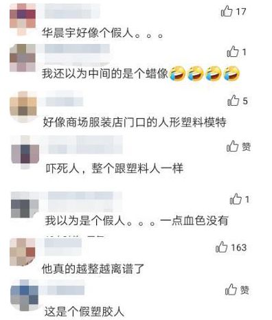 这合照扫一眼就会看到华晨宇那白的发光的脸,远远看起真的就像是个人偶一样,脸上的表情也是非常的高冷,让人产生了这是个雕像的错觉,对此还有很多网友都在吐槽,觉得说华晨宇这是去整容了,整的非常的僵硬,万千都是毁了的节奏。