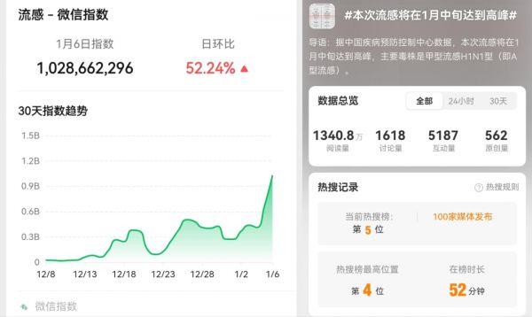「流感」的微信指数也在近日呈现快速增长,截至发稿,日环比已上涨 52.24%。而「本次流感将在 1 月中旬达到高峰」的词条更是登上微博热搜,截至发稿已经获得超千万的阅读量。