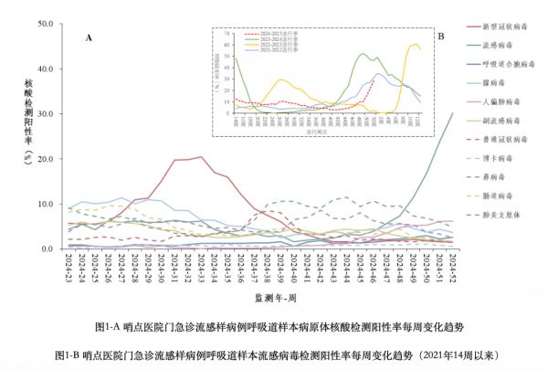 鼻病毒阳性率持续下降;北方省份肺炎支原体阳性率持续下降,南方省份肺炎支原体感染仍处于较低水平。腺病毒阳性率呈波动下降趋势。新型冠状病毒等其他呼吸道病原体处于较低流行水平。