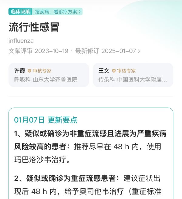 用药助手临床决策根据最新研究、指南和中国医生临床实践经验,为流感诊断、治疗和预防提供了分步指导。