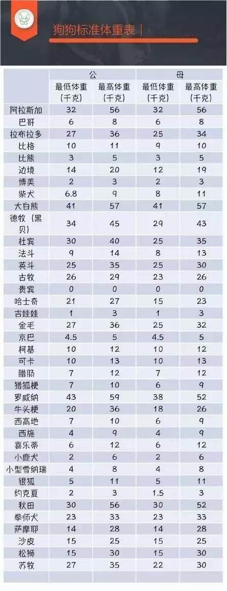 狗狗的标准体重可参考下图(暂无贵宾犬的数据,因为贵宾犬分为迷你型、玩具型和标准型,所以无法通过数据来判断):