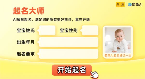 了解运势与健康的朋友们都知道,名字与命运息息相关。如果你最近感觉事情不顺,也许在于名字的不合适。而今天,我们借助简单AI的智能化起名功能,能够实现精准起名,让名字为您带来好运啦!这款工具结合了大量的风水知识和道学理论,根据您的信息起个既好听又寓意佳的名字。快来试试,或许好运会在此转身而来!简单AI链接(免费,长按复制链接致浏览器体验):https://ai.sohu.com/pc/generate?trans=030001_yljdaiys