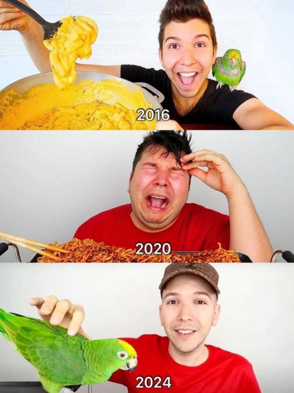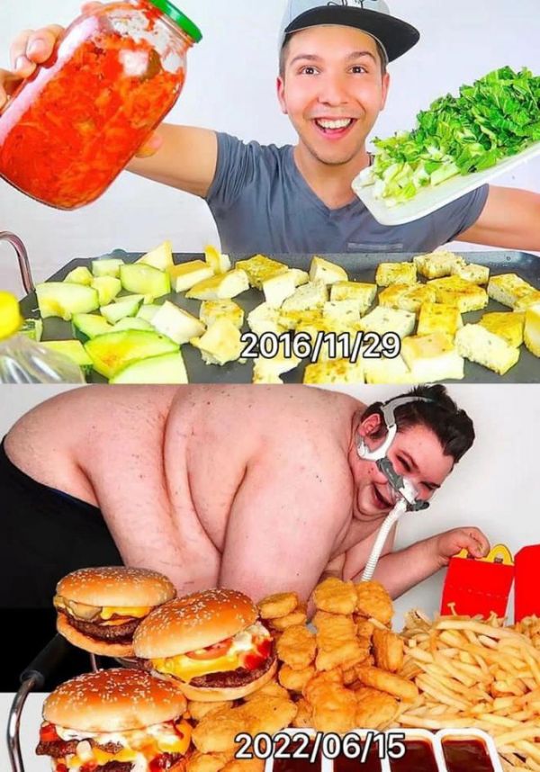 当时 Nikocado 打着素食者开荤吃肉的噱头,很快他便累积大量流量。然而因为这是他的全职工作,—短短半年他就胖了25公斤,日复一日的暴饮暴食,导致最终他的体重暴涨到186公斤!