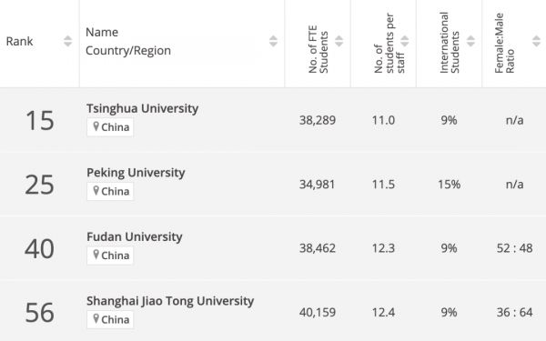 此外,中国共有 9 所高校进入前 100 名,其中清华大学(第 15 位)、北京大学(第 25 位)、复旦大学(第 40 位)三所高校进入前 50 名。