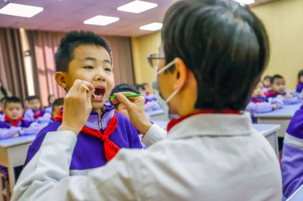 医生在河北省遵化市第四实验小学给学生做口腔检查。新华社发(刘满仓摄)