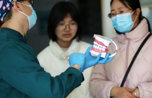 在山东省临沂市郯城县郯城街道卫生院口腔科,医生给居民讲解口腔健康知识。新华社发(张春雷摄)