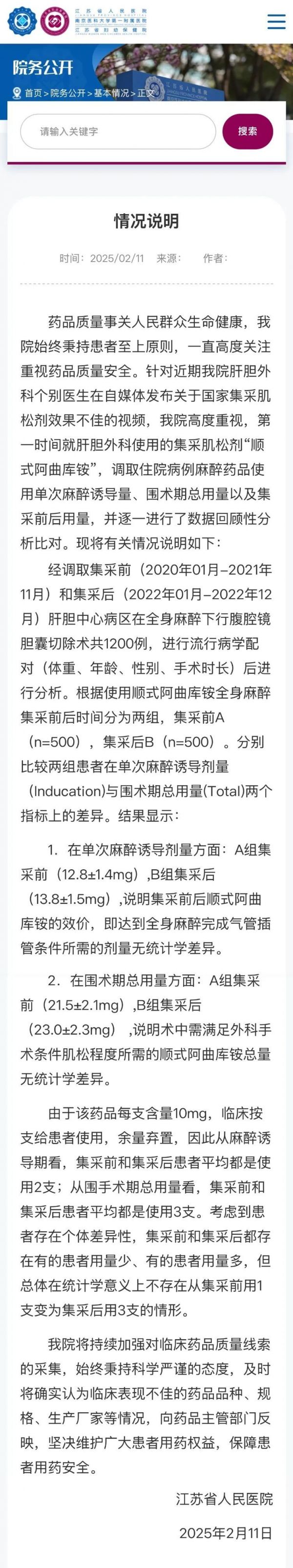 2 月 11 日,江苏省人民医院发布情况说明,针对近期该院肝胆外科个别医生在自媒体发布关于国家集采肌松剂效果不佳的视频作出回应。