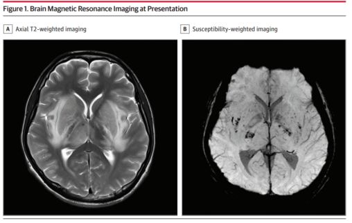 MRI 示大脑深层灰质核团及周围白质广泛 T2 加权高信号、局灶性扩散受限以及多发微出血灶。进一步补充 FDG-PET/CT 检查,显示肿大的颈部淋巴结和脾脏摄取增加。