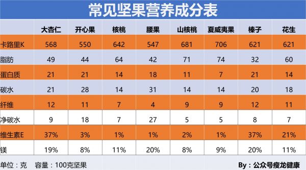 坚果有很多种,不是每一种坚果都是一个妈生的,营养成分肯定不一样,如果你要更加精准一点,那么可以参考下面的营养成分,下面我一种一种坚果来介绍。