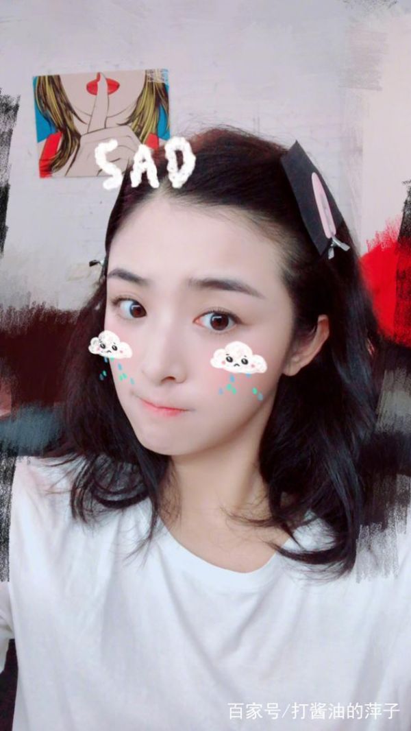 她还配上了一张"委屈"的自拍照,照片中张含韵的头顶上写着一个大大的"sad",两片下雨的乌云贴纸贴在两边脸颊俏皮可爱,只是成功瘦出小V脸的张含韵也是很拼呢。