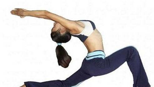 3.吸气时,两臂由前上举,掌心朝前。保持右侧小腿与地面垂直。收臀,同时上提骶骨和肋骨,脊柱后弯,让身体的后侧好似一弯新月的形状。颈部后仰,看上方,轻柔地呼吸。保持5~15秒。