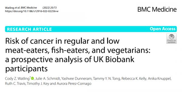 [4]Watling CZ, Schmidt JA, Dunneram Y, Tong TYN, Kelly RK, Knuppel A, Travis RC, Key TJ, Perez-Cornago A. Risk of cancer in regular and low meat-eaters, fish-eaters, and vegetarians: a prospective analysis of UK Biobank participants. BMC Med. 2022 Feb 24;20(1):73. doi: 10.1186/s12916-022-02256-w. PMID: 35197066; PMCID: PMC8867885.