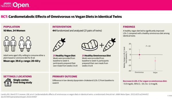 [2]Landry MJ, Ward CP, Cunanan KM, et al. Cardiometabolic Effects of Omnivorous vs Vegan Diets in Identical Twins: A Randomized Clinical Trial. JAMA Netw Open. 2023;6(11):e2344457. doi:10.1001/jamanetworkopen.2023.44457
