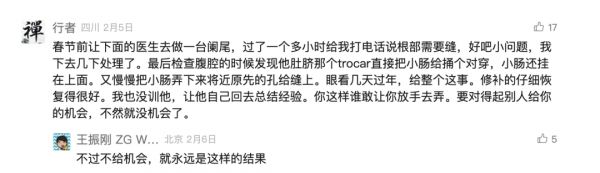 究其原因,发现最后在检查腹腔的时候,患者肚脐的 Trocar(注:腹腔镜手术腹内外的通道)直接把小肠给捅个对穿,小肠还挂在上面。于是,又慢慢把小肠弄下来,将原先的孔给缝上。
