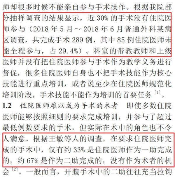 但北京大学人民医院的一篇研究结果显示,有近 30% 的手术没有住院医师参与。在要求住院医师完成的手术中,仅有约 33% 是住院医师作为一助完成,约 67% 是作为二助完成,没有作为术者的机会。[3]