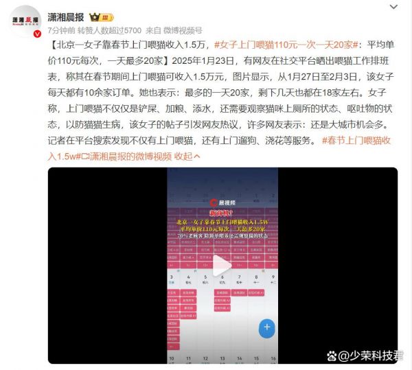 在刚刚过去的春节假期,当大多数人都沉浸在与家人团聚的温馨时光中时,北京一位女子却凭借着一份独特的兼职,在这个假期收获了令人咋舌的收入 ——1.5 万元。她的这份工作,便是上门喂猫。