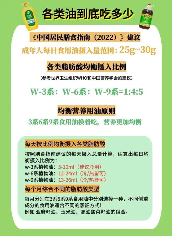 第三,油要换着吃。没有哪一种油是一定就好的,不要长期只吃一种油,各种不饱和脂肪的食用油要换着吃,最好吃完这一桶换一种油。