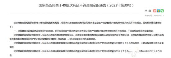 据国家药品监督管理总局发布的49批次药品不符合规定的通告,朗迪制药竟有32批次碳酸钙D3颗粒不符合规定。分别为北京振东朗迪制药、北京振东朗迪制药委托振东制药、北京振东康远制药委托振东制药生产的24批次碳酸钙D3颗粒不符合规定;朗迪制药委托振东制药生产的7批次碳酸钙颗粒(Ⅱ)不合格;朗迪制药委托振东制药生产的1批次碳酸钙D3片(Ⅱ)不符合规定,不符合规定项目均为“[含量测定]维生素D3”。