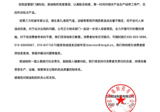 此后,朗迪制药发布紧急声明表示,收到监管部门通知后,高度重视,认真配合检查,第一时间对相关产品生产线停工停产,召回所涉批次产品。同时称,经第三方权威专家认证,维生素D3易因气温、运输等客观环境因素造成含量不稳定,但不会对人体造成伤害,对于此次出现的无人能提,公司正与相关部门一起进一步深入排查原因等。