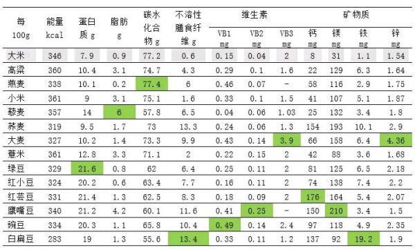 杂粮含有丰富的B族维生素,钙、铁、锌等矿物质含量也远高于精大米。这些营养素对维持身体的正常功能具有非常重要的作用。比如B族维生素普遍以辅酶的形式广泛参与身体内的各种生理过程,是推动体内代谢,把糖、脂肪、蛋白质等转换为能量不可或缺的物质。钙能形成坚固的骨架以支撑整个身体,保护心、肺、牙齿等;铁是构成细胞的原料,参与体内血红蛋白、肌红蛋白及某些酶的合成;锌能促进生长发育与组织再生,促进维生素A的代谢,并参与免疫功能。